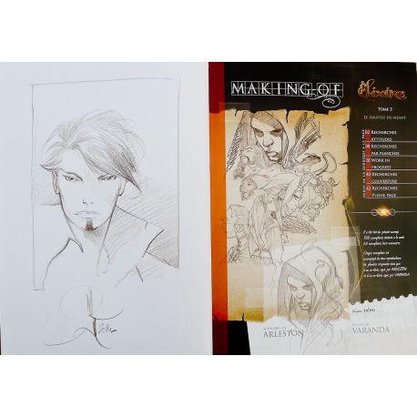 Somptueux tirage de tête Editions Bruno Graff, format 23 x 32 cm, cartonné, dos toilé, 2 ex-libris, un signé Varanda, l'autre Arleston, plus 2 posters repros de planches, tirage limité à 300 exemplaires, prix public 100 €. Tout beau : 48 pages de recherches et crayonnés, tout l'album en crayonné au format 9 x 13 cm, plus l'album en couleur. Et une magnifique dédicace d'Alberto VARANDA.